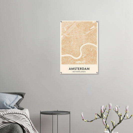 Minimalist Amsterdam Map Print - Acrylic Print – Scandinavian Wall Art, Fine Art City Map Poster, 50x70cm/20x28