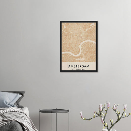 Minimalist Amsterdam Map Print with wooden frame and matte paper – Scandinavian Wall Art, Fine Art City Map Poster, 50x70cm/20x28